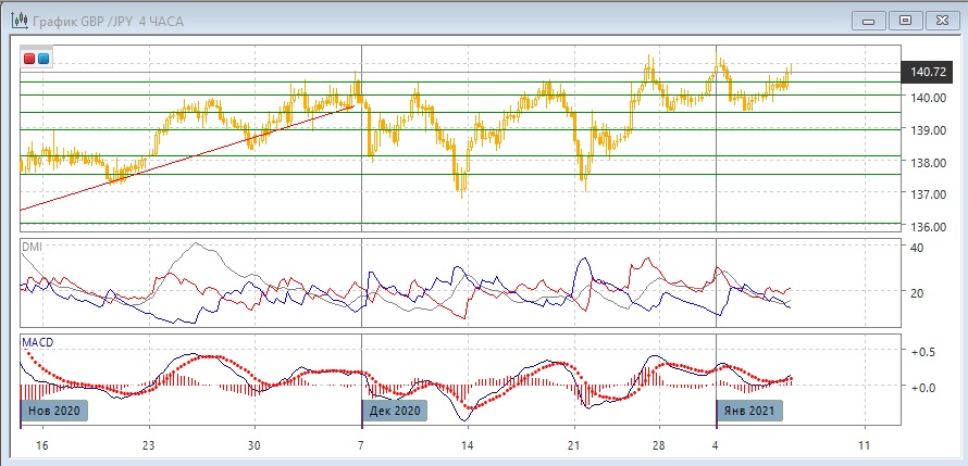 На четырёхчасовом графике можно рассматривать более узкий диапазон 139,50-141,00, на верхней границе может образоваться третья вершина, что, потенциально, делает целью возвращение к 139,50. По индикаторам направленного движения остаётся флэт: ADX на низком уровне, гистограмма MACD колеблется около нуля, линия MACD с конца декабря также колеблется. При откате ближайшая поддержка на 140,40 - верхней границе более широкого диапазона дневного графика.