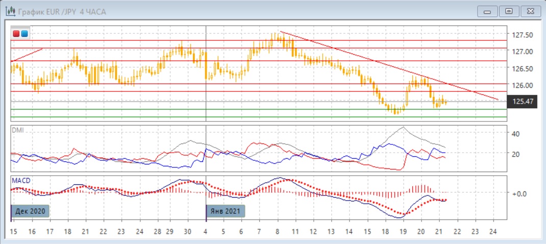 На четырёхчасовом графике рост от 18 января боле определённо видится как коррекционный, и завершение коррекции делает целью уровень минимума 18 января выше 125,00. Отскок вверх от 125,25 был относительно небольшим по величине и медленным, по сравнению со скоростью снижения от 126,00 20 января. Это даёт основание рассматривать отскок от 125,25 как коррекцию к волне снижения, что укладывается в большее широкую картину завершения коррекции к большой волне снижения с 8 января. По индикаторам направленного движения ситуация нейтральная: DM- и DM+ пересекаются, гистограмма MACD около нуля, линия MACD примерно горизонтальна. Если баланс сохранится и пара будет удерживаться выше 125,00-125,25, откат может быть от новой линии тренда, если строить её, учитывая максимумы 19-20 января.