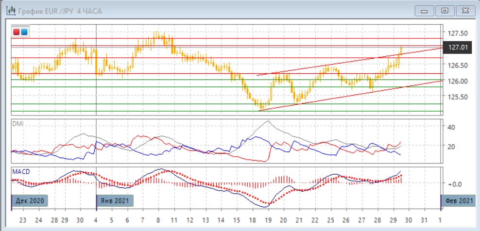 На четырёхчасовом графике пара находится у верхней границы восходящего канала с 18 января, которая может выступить сопротивлением для пары. Преодоление уровня 126,50, который ограничивал рост 28 и в начале 29 января (это также уровень, близкий к относительному максимуму 22-25 января) является бычьим сигналом. При преодолении сильного сопротивление на 126,70 (верхняя граница канала в декабря) рост может продолжиться.