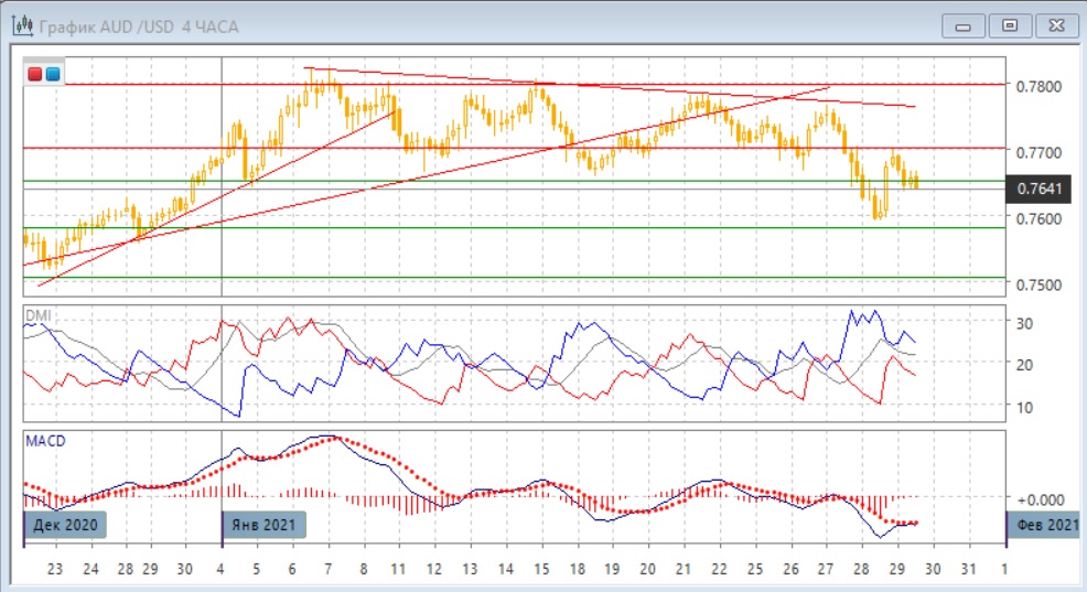 На четырёхчасовом графике при отскоке вверх 28 января уровень 0,7700 выступил уже сопротивлением. Сейчас пара находится у уровня поддержки ниже на 0,7650. Около этого уровня были минимумы 4, 11, 18 января. Возвращение ниже 0,7650 снова приведёт пару ниже нижней границы диапазона января, что потенциально открыло бы пространство для значительного снижения. Если исходить из размера диапазона в 150 пунктов, целью может быть 0,7500 - это совпадает к сильным "круглым" уровнем поддержки. По индикаторам направленного движения тенденцией является снижение: DM- выше DM+, гистограмма MACD остаётся в отрицательной зоне и при отскоке вверх.