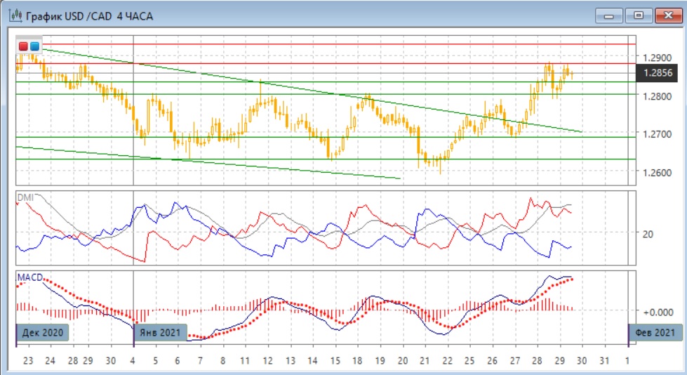 На четырёхчасовом графике пара лучше видно, что пара вышла из диапазона в январе 1,2630-1,2800 вверх, при откате вниз от 1,2880 верхняя граница диапазона 1,2800 выступила уже поддержкой. Исходя из размера диапазона в 170 пунктов целью движения вверх может быть 1,2870, что близко к психологически важному уровню 1,3000. По индикаторам направленного движения рост становится хорошо выраженной тенденцией: превышение DM+ над DM- большое при высоком уровне ADX, гистограмма MACD остаётся в положительной зоне, линия MACD сохраняет положительный наклон. В ближайшей перспективе тестирования уровня 1,2880, вероятно, продолжится.