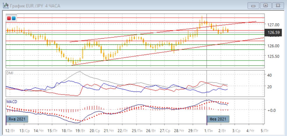 На четырёхчасовом графике пара снижается от сопротивления на 127,00, при этом разворот был с образованием "падающей звезды", которая коснулась сопротивления на 127,30. Пара вернулась в восходящий канал с 18 января. Верхняя граница канала является теперь сопротивлением, которое проявилось 1 февраля. Если рассматривать движение в канале, то после ложного пробоя верхней границы возвращение к нижней предпочтительно. Однако сейчас пара получила поддержку на уровне 126,50, около которого находился относительный максимум 22-25 января, и сопротивление 28-29 января. Учитывая слабое движение, поддержка может устоять. В более длительной перспективе возобновление роста кажется предпочтительным, так как тенденция роста сохраняется, и откат не выходит за рамки коррекционного. По индикаторам направленного движения коррекция к росту: превышение DM+ над DM- сохраняется, коррекция видна по снижению гистограммы MACD и развороту линии MACD.