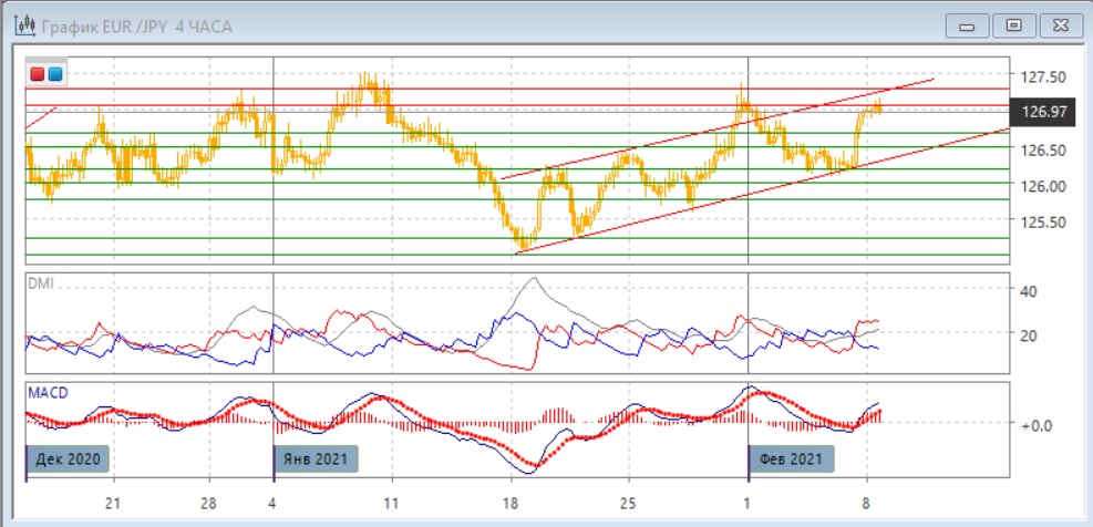 На дневном графике пара выросла от нижней границы восходящего канала с 18 января, и она приблизилась к сопротивлению на 127,30 (на максимумах конца декабря, начала и конца января). Также рядом находится верхняя граница восходящего канала, что укрепляет сопротивление. Исходя из того, что относительно сильный рост произошёл после образования нескольких свечей "дожи", импульс движения вверх в краткосрочной перспективе может сохраниться, и уровень 127,30, вероятно, будет тестироваться. Последовательность роста относительных максимумов и минимумов с 18 января не была нарушена. По индикаторам направленного движения тенденцией является рост: DM+ значительно выше DM-, уровень ADX растёт, гистограмма MACD растёт уже в положительной зоне, линия MACD имеет слабый положительный наклон.