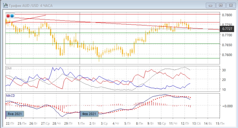 На четырёхчасовом графике пара снизилась от уровня 0,7760, где был предыдущий максимум 10 февраля, при этом образовалась "падающая звезда". При откате снижение замедлилось у "круглого" уровня 0,7700 и в районе линии нисходящего тренда. Краткосрочно пара снижается, это видно по снижению гистограммы MACD и развороту вниз линии MACD. Однако боле долгосрочно тенденция не изменилась: рост относительных максимумов и минимумов с 5 февраля продолжается, по ADX тенденция роста сохраняется. Ключевым для сохранения тенденции роста в ближайшей перспективе является удержание уровня 0,7700 - пока пара выше этого уровня, и не вернулась ниже линии нисходящего тренда, вероятность возобновления роста кажется выше, чем более глубокой коррекции при преодолении 0,7700.