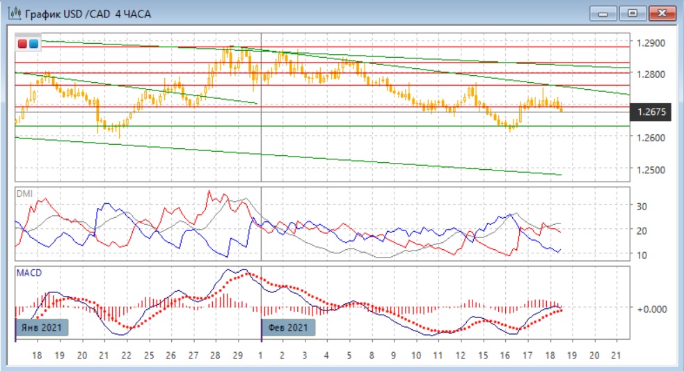 На дневном графике произошёл отскок от уровня поддержки 1,2630 (этот уровень проявлялся в январе). Однако развития движения не было, снова образовалась "падающая звезда" ниже 1,2760. Вероятно, пара вернётся к 1,2630 и вероятность прорыва этого уровня будет уже выше. Более долгосрочно пара остаётся в нисходящем канале, что также делает снижение более предпочтительным. По индикаторам направленного движения сохраняется флэт: ADX на очень низком уровне и снижается, DM+ и DM- близки, по более краткосрочным индикаторам тенденцией является снижение: гистограмма MACD находится в отрицательной зоне, линия MACD имеет отрицательный наклон.