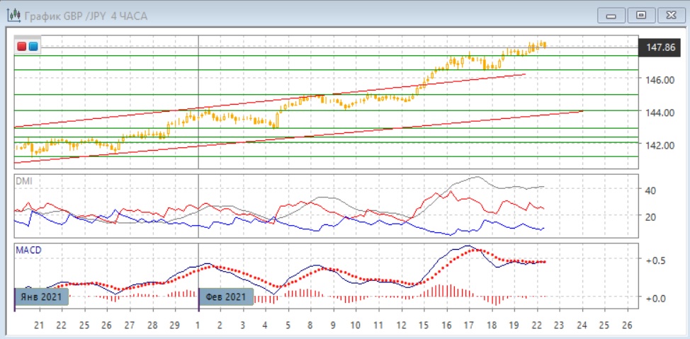 На четырёхчасовом графике откат уже выглядит вероятным: образовалось медвежье расхождение максимумов пары и гистограммы MACD, по линии и гистограмме MACD последняя волна роста не подтверждается. По ADX тенденция, однако, остаётся сильной. Медвежье расхождение образовалось и 18 февраля, но подтверждения этого сигнала не произошло. В это масштабе рассчитывать на рост опасно, хотя тенденция роста сохраняется, что видно по достижению новых максимумов. При откате пара может получить поддержку на верхней границе канала у 147. Выше - на сопротивление 16-17 и поддержке 19 февраля 147,40.