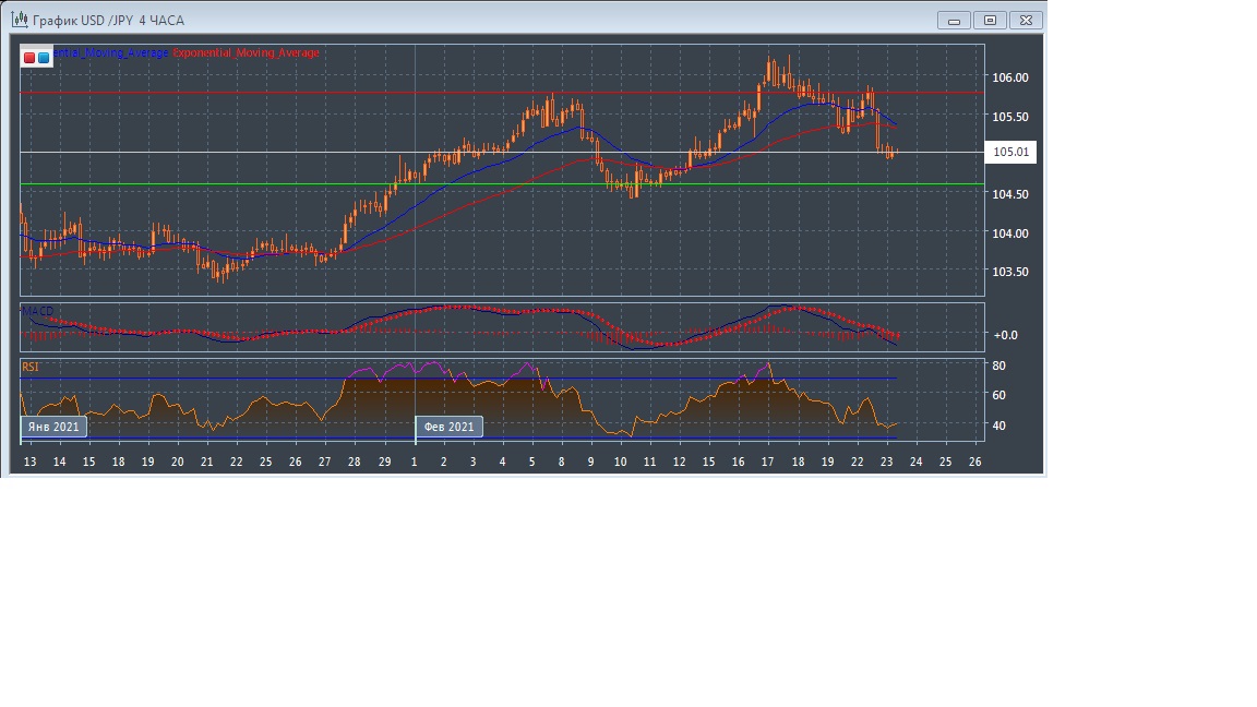 В течение азиатской торговой сессии во вторник валютная пара USD/JPY торгуется с понижением котировок, оставаясь в пределах текущего уровня поддержки на 104.59 и уровня сопротивления в районе отметки 105.77.