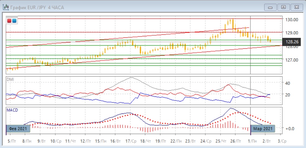 На дневном графике пара снижается в восходящем канале, начавшемся в середине января. Сейчас пара достигла поддержки на максимуме середины февраля около 128,40, далее поддержки можно ожидать на нижней границе канала (она же линия тренда) у 128,00. Нижняя граница, вероятно, будет тестироваться, учитывая ложный пробой вверх, но пока изменения тенденции нет: последовательность роста относительных минимумов пары не нарушена, пара выше линии тренда. По индикаторам направленного движения тенденцией является рост: превышение DM+ над DM- большое, ADX на высоком уровне и растёт, линия MACD имеет положительный наклон, гистограмма MACD остаётся в положительной зоне.
