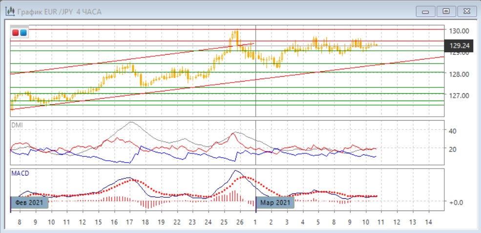 На дневном графике пара продолжила тестировать уровень 129,45. С начала марта пара находится почти на одном уровне, с поддержкой на 129 и сопротивлением на 129,45. Отсутствие отката пары от 129,45 после образования нескольких "падающих звёзд" может быть бычьим сигналом, так как медвежьи не срабатывают. Постепенно пара приближается к линии тренда (нижняя граница канала), и поддержка может усилиться. По индикаторам направленного движения коррекция к снижению: превышение DM+ над DM- остаётся большим, ADX на высоком уровне и растёт, гистограмма MACD снижается.
