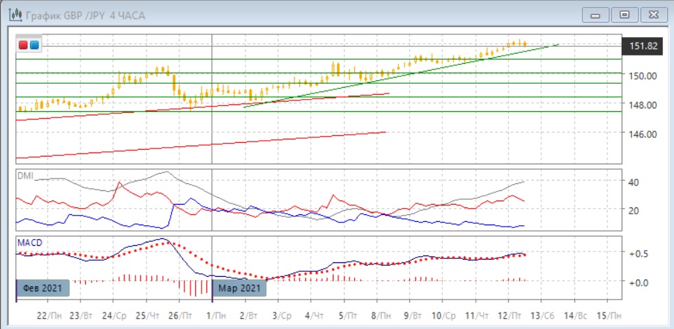На четырёхчасовом графике также есть расхождение максимумов пары и гистограммы MACD. Оно уже тройное. Сигналом подтверждения может быть преодоление линии восходящего тренда в марте, который находится недалеко. Однако, на линии тренда пара может получить и поддержку. Тенденция роста сейчас не нарушена, относительных минимумы и максимумы пары растут. По ADX тенденция роста сильная и в этом масштабе. При том, что продолжение роста предпочтительно, рост почти в 500 пунктов в марте без существенных откатов также увеличивает вероятность возможного отката, поэтому рассчитывать на продолжение роста сейчас рискованно.