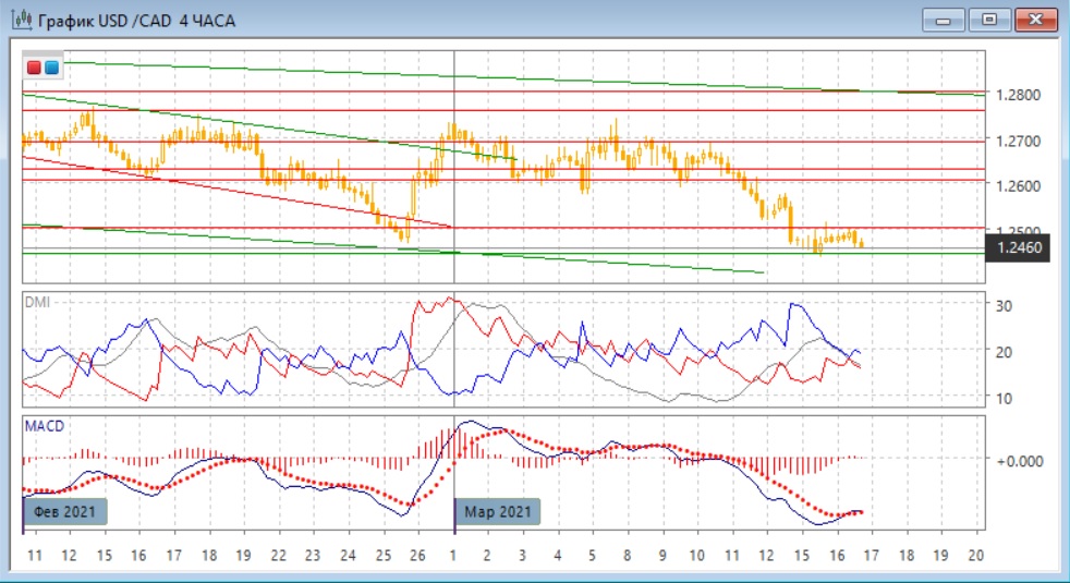 На дневном графике снижение продолжилось и произошло закрытие ниже важного уровня 1,2500. Пара остаётся ниже этого уровня, и таким образом вероятность прокола или ложного пробоя снизилась. Снижение остаётся предпочтительным. По индикаторам направленного движения тенденцией является снижение: DM- значительно выше DM+, гистограмма MACD снижается в отрицательной зоне, линия MACD имеет отрицательный наклон. В более долгосрочной перспективе пара остаётся в нисходящем канале с декабря, его нижняя граница сейчас около 1,2400.