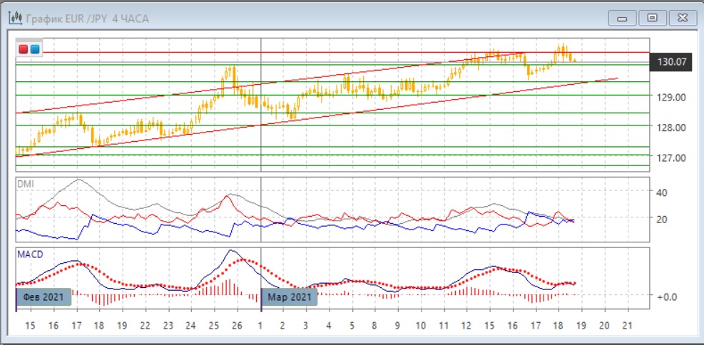 На четырёхчасовом графике, возможно, образовался должный пробой уровня 130,40. Это в ближайшей перспективе предполагает возвращение к нижней границе предыдущего диапазона 130,00-130,40, в который пара вернулась, и потенциально - выход из этого диапазона вниз, после ложного пробоя и образования параллельно с этим медвежьего расхождения максимумов пары и гистограммы MACD в этом масштабе. Целью в этом случае видится возвращение к минимуму 16 марта у уровня поддержки 129,45. По индикаторам направленного движения в этом масштабе флэт: DM+ и DM- близки, гистограмма MACD около нулевого уровня, линия MACD примерно горизонтальна.