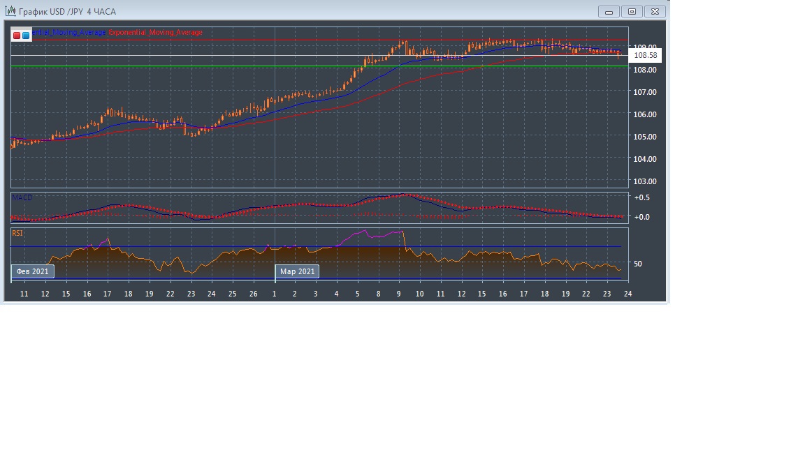 Скользящие средние с периодом 21 и 55 дней чуть замедлились и продолжают движение вниз, сокращая расхождение, что является признаком появления слабого медвежьего тренда данного рынка в краткосрочной перспективе. Четырёхчасовой график прогрессирует чуть ниже экспоненциальных скользящих средних, так же демонстрируя появление нисходящего потенциала этого рынка в краткосрочной перспективе.