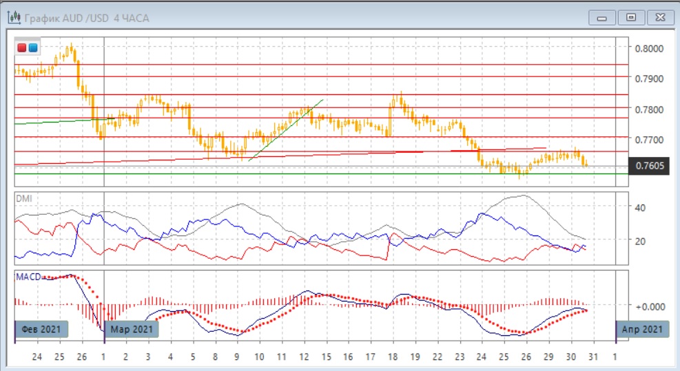 На четырёхчасовом графике рост был ограничен уровнем 0,7650. Движение от 0,7580, вероятно, было коррекционным, и теперь можно предполагать завершение коррекции с возвращением к исходной точке 0,7580. Более значительное движение, вероятно, будет в сторону выхода из диапазона 0,7580-0,7650. Снижение после консолидации тестирования уровня 0,7650 показывает, что направлением наименьшего сопротивления сейчас является снижение.