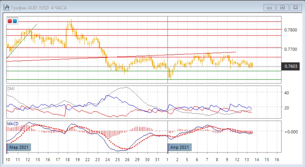 На четырёхчасовом графике пара остаётся в диапазоне 0,7580-0,7650, и более краткосрочно - на "круглом" уровне 0,7600, который выступал поддержкой с начала апреля. Так как сейчас относительные максимумы постепенно снижаются (с 7 апреля), более вероятным видится выход вниз. По индикаторам направленного движения снижение является слабой тенденцией: DM- выше DM+ при ещё низком уровне ADX, гистограмма MACD немного ниже нуля, линия MACD имеет слабый отрицательный наклон.