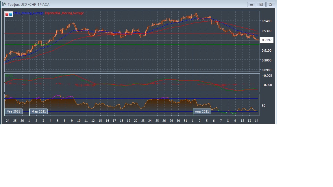 На четырёхчасовом графике скользящие средние с периодом 21 и 55 дней продолжают двигаться вниз, сохраняя расхождение, что говорит о хорошем медвежьем потенциале. Таким образом, общий тренд в краткосрочной перспективе остаётся нисходящим. График котировок прогрессирует в области ниже экспоненциальных скользящих средних, подтверждая медвежий потенциал данного рынка в краткосрочной перспективе.