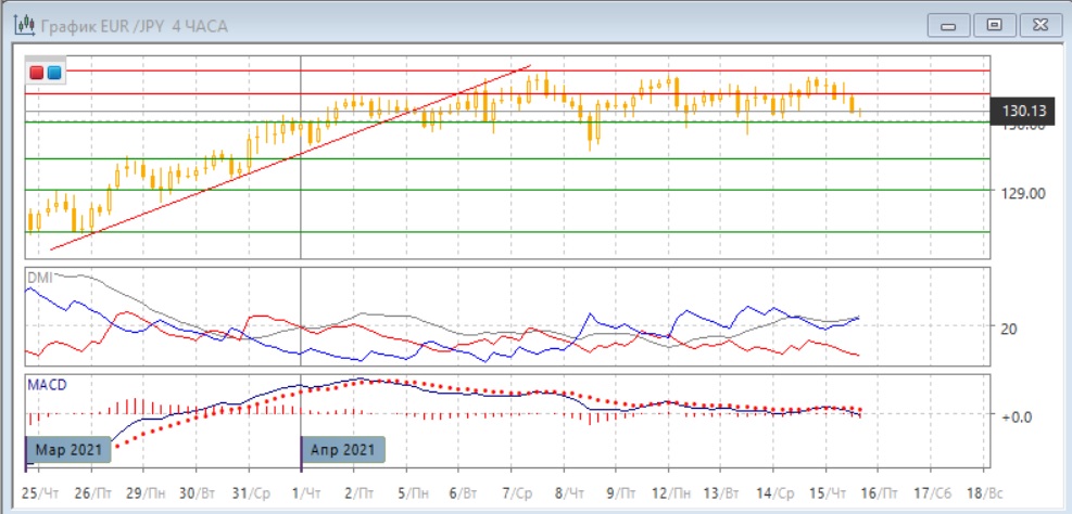 На четырёхчасовом графике пара снижается в канале 130,00-130,70 от верхней границы, исходя из движения в канале вероятно приближение к нижней границе на 130,00. Пара долго находится в узком диапазоне, и хотя импульса для выхода из него сейчас не видно, выход из диапазона назревает хотя бы исходя из длительности диапазона в этом масштабе. Рассчитывать на движение вне диапазона раньше фактического выхода не стоит, так как уровни поддержки и сопротивления на границах диапазона сильные.