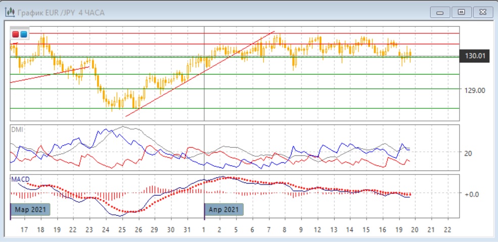 На четырёхчасовом графике пара тестирует нижнюю границу канала 130,00-130,70. Закрепления ниже не произошло, но пара постепенно снижается с 14 апреля, и выход вниз сейчас более вероятен. В этом случае, исходя из ширины канала в 70 пунктов, целью может быть 129,30. Это близко к следующей поддержке на 129,45 - уровня, рядом с котором было много относительных максимумов и минимумов в марте. По индикаторам направленного движения тенденцией является снижение: DM- выше DM+, уровень ADX относительно высокий, линия MACD имеет отрицательный наклон.