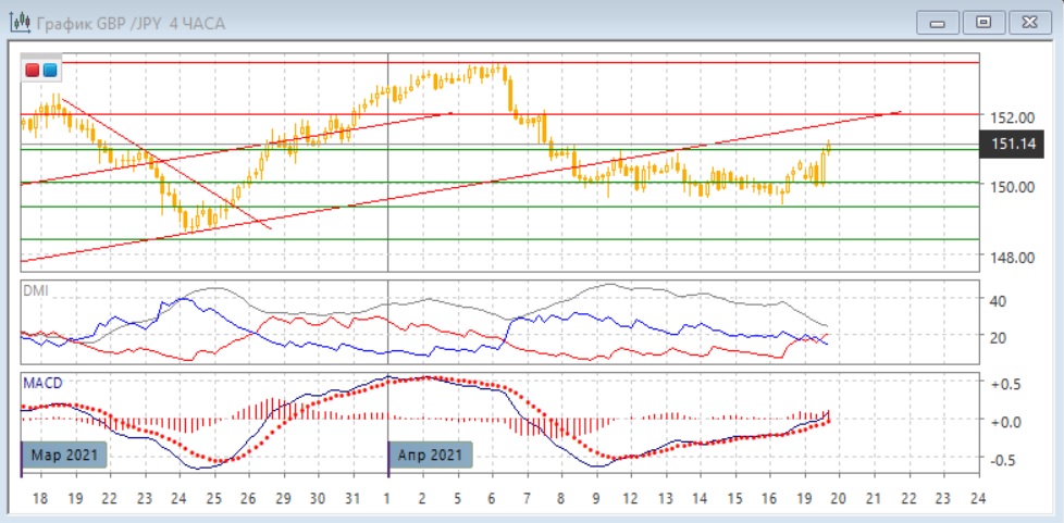 На четырёхчасовом графике произошёл разворот. Пара достигла сопротивления на 151,00 и находится выше этого уровня, после снижения относительных максимумов пары с 6 апреля теперь они растут. Тенденция изменилась также по индикаторам направленного движения: DM+ теперь выше DM-, гистограмма MACD растёт в положительной зоне, линия MACD имеет положительный наклон. Целью сейчас видится точка совпадения линии тренда и уровня сопротивления 152,00.