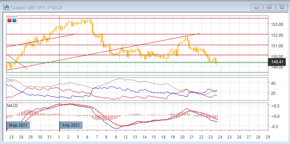 На четырёхчасовом графике уровень 150,00 выступил уже сопротивлением, после отскока вверх к которому пара возобновила снижение 23 апреля. Более вероятным сейчас является снижение. Пара закрепилась ниже минимумов середины апреля, что облегчает дальнейшее снижение. По индикаторам направленного движения тенденцией стало снижение: DM- выше DM+, уровень ADX восстановился, гистограмма MACD остаётся в отрицательной зоне, линия MACD имеет отрицательный наклон.