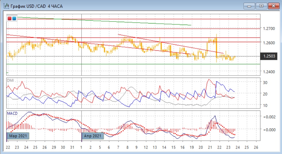 На четырёхчасовом графике пара закрепилась ниже "круглого" уровня 1,2500 - 22 и 23 апреля этот уровень выступает сопротивлением для пары. Это согласуется в картиной преодоления уровня поддержки на 1,2500, и делает предпочтительным продолжение снижения. По индикаторам направленного движения тенденцией также является снижение: сохраняется превышение DM- над DM+, гистограмма MACD находится в отрицательной зоне, линия MACD имеет отрицательный наклон.