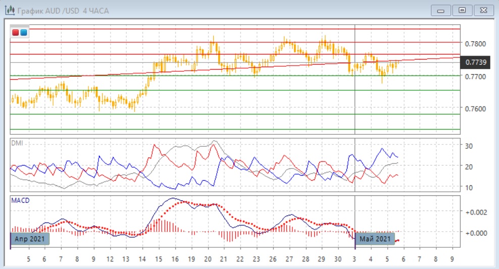На четырёхчасовом графике продолжается движение в диапазоне 0,7700-0,7800. Пара вновь получила поддержку на нижней границе, и отскок от неё был остановлен на "линии шеи" модели "голова-плечи" на дневном графике. Преодоление этой линии облегчило бы движение к верхней границе диапазона на 0,7800. По индикаторам направленного движения тенденция снижения ослабляется: при сохранении превышения DM- над DM+ новые минимумы пары не подтверждались новыми минимумами по гистограмме MACD.