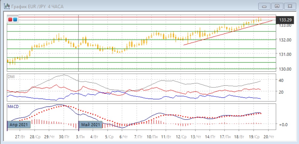 На четырёхчасовом графике также имеется медвежье расхождение максимумов пары и гистограммы MACD, но пока остаётся выше линии тренда с 12 мая, подтверждения сигнала нет. В этом масштабе тенденция роста по ADX также сильная: превышение DM+ над DM- большое и устойчивое, ADX на высоком уровне. Рост замедляется, и сигналом отката может быть преодоление линии тренда и уровня 133,00.