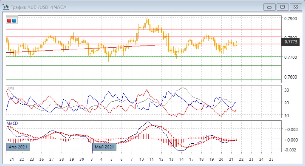 На четырёхчасовом графике пара растёт после приближения к нижней границе канала на 07700. Ниже сопротивления на 0,7765 образовался небольшой "молот", если он будет подтверждён свечой роста, это может облегчить преодоление уровня 0,7765 и облегчит достижение верхней границы канала. Однако, учитывая что движение проходит в довольно узком диапазоне с середины апреля, импульса для достижения 0,7800 может не хватить. По гистограмме MACD и линии MACD пара во флэте: гистограмма около нуля, линия MACD почти горизонтальна.