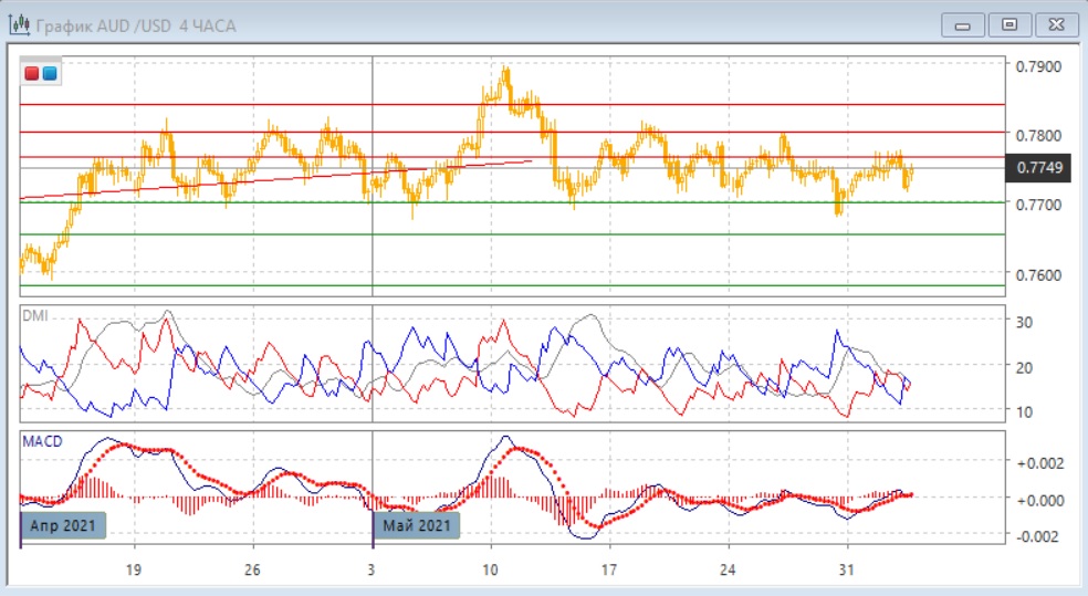 На четырёхчасовом графике пара снизилась от сопротивления на 0,7765, и при откате пара снова получила поддержку около "круглого" уровня 0,7700. Сейчас пара, вероятно, будет возвращаться к сопротивлению на 0,7765, и в рамках движения в диапазоне более вероятно достижение верхней границы на 0,7800. По индикаторам направленного движения пара остаётся во флэте: DM+ и DM- пересекаются, уровень ADX низкий, гистограмма MACD продолжает колебания около нулевого уровня.