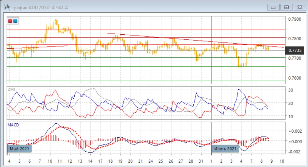 На четырёхчасовом графике рост приостановился на сочетании нисходящей линии тренда и уровня сопротивления 0,7765. Однако отката от этого уровня не произошло, и пара остаётся рядом немного ниже. Дальнейшая краткосрочная перспектива, вероятно, будет зависеть от того, преодолеет ли пара зону сопротивления: При преодолении 0,7765 пара выходила бы к следующему "круглому" уровню 0,7800.
