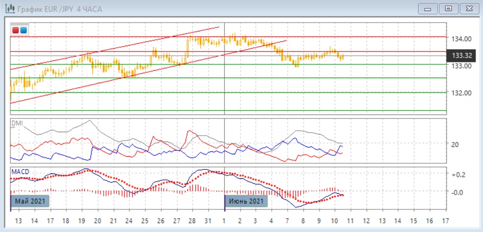 На четырёхчасовом графике при откате от 133,50 пара не достигла исходной точки коррекции на 133,00. Это оставляет возможность или более продолжительного отскока, или преодоления 133,50 на третьей волне, а восстановление выше 133,50 скорее приводило бы пару с максимумам конца мая - начала июня на 134,00. Дальнейшее движение более вероятно в направлении выхода за границы 133,00-133,50.