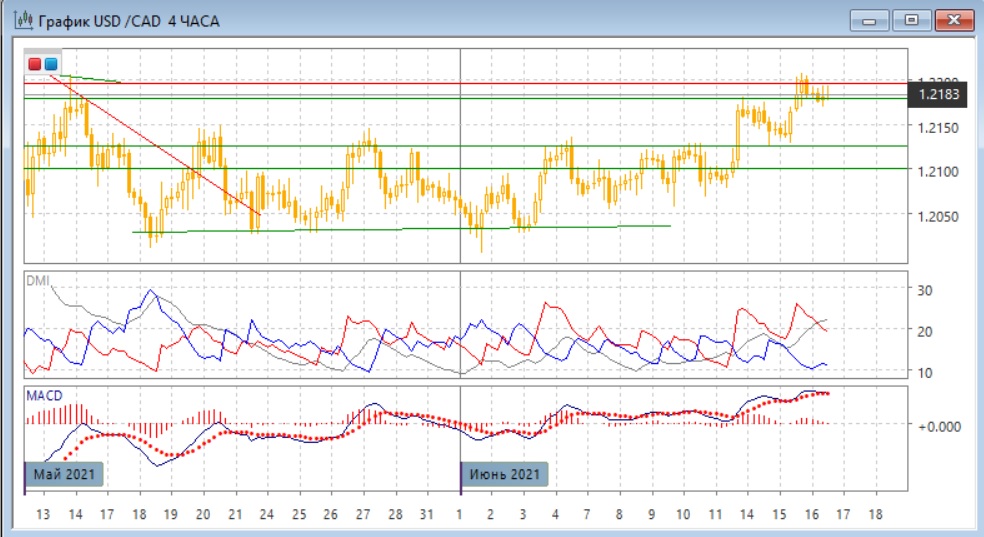 На четырёхчасовом графике последовательный рост продолжается. При откате от "круглого" уровня 1,2000 пара получила поддержку на максимумах 11-14 июня у 1,2180. Хотя образовалось медвежье расхождение максимумов пары и гистограммы MACD, что укрепляет сопротивление на 1,2200 и увеличивает вероятность отката, подтверждения этого сигнала не было. По ADX тенденция роста сильная: превышение DM+ над DM- большое при относительно высоком уровне ADX.