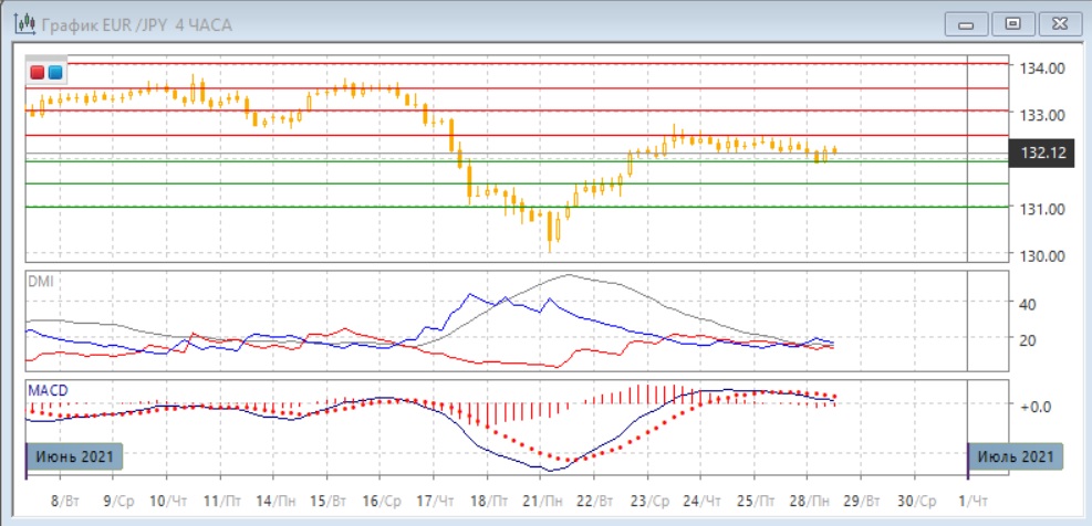 На дневном графике пара остаётся у уровня сопротивления 132,50 - около максимума конца апреля, относительного минимума конца мая и середины июня. Пара остаётся в узком диапазоне ниже 132,50 (132-132,50), и дальнейшее движение, вероятно, будет в сторону выхода из него. При росте коррекция превращается в разворот, а при снижении ниже 132,00 снижение может продолжиться, предполагая завершение коррекции к снижению, которая началась от 130,00. По индикаторам направленного движения - коррекция к снижению: DM- остаётся значительно выше DM+, линия MACD имеет отрицательный наклон, коррекция видна по росту гистограммы MACD.