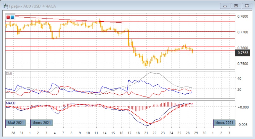 На четырёхчасовом графике пара снизилась ниже зоны сопротивления 0,7580-0,7600, после ложного пробоя уровня 0,7600 вверх. Так как результат тестирования зоны сопротивления, кажется, неудачный, то более вероятно, то снижение будет продолжаться. Сильной поддержки до 0,7500 сейчас не видно. По снижения ниже 0,7580 образовалось медвежье расхождение максимумов пары и гистограммы MACD. Преодоление уровня 0,7580 может быть подтверждением сигнала. По индикаторам направленного движения происходит разворот: превышения DM+ над DM- уже нет, линия MACD перешла к горизонтали, гистограмма MACD снижается уже в отрицательной зоне.
