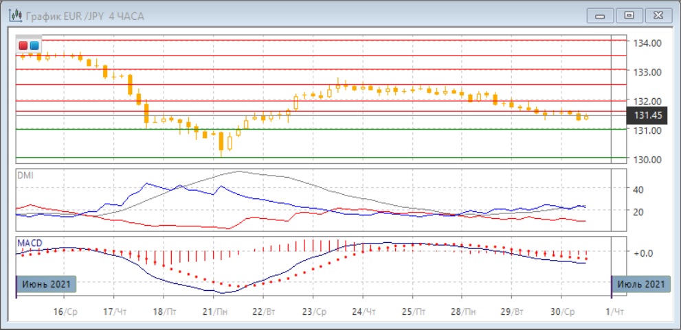 На четырёхчасовом графике пара постепенно снижается, уровень 131,50 выступает уже сопротивлением для пары при тестировании его снизу. По индикаторам направленного движения тенденцией стало снижение: превышение DM- над DM+ увеличилось, гистограмма MACD остается в отрицательной зоне, линия MACD имеет слабый отрицательный наклон. Ближайшей целью является уровень 131,00.
