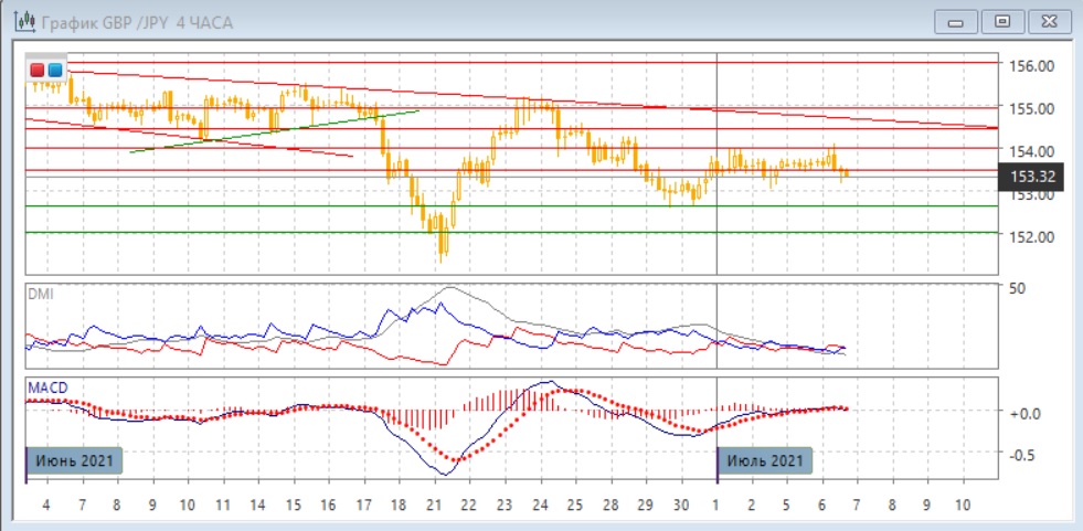 На дневном графике пара осталась ниже сопротивления на 154,00. Это укрепляется сопротивление на уровне и сохраняет картину большой вершины у 156,00. Пока уровень 154,00 не преодолен, краткосрочно более вероятным кажется откат к предыдущему минимуму на 152,65. Пара остаётся ниже линии нисходящего тренда, если строить её с конца мая. По индикаторам направленного движения тенденцией остаётся снижение: DM- выше DM+, ADX на относительно высоком уровне, линия MACD имеет отрицательный наклон, гистограмма MACD находится в отрицательной зоне.