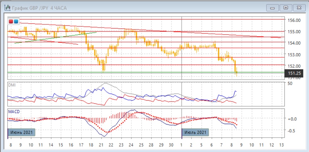 На четырёхчасовом графике пара получила поддержку на уровне минимума июня (около 151,35). Отскок вверх от этого уровня, однако, не является энергичным, и говорить о том, что пара закрепилась выше этой поддержки пока рано. Краткосрочно тенденция снижения сохраняется и усиливается. По индикаторам направленного движения также видно усиление тенденции снижения: превышение DM- над DM+ увеличивается, уровень ADX вырос. Действовать стоит, вероятно, в направлении движения от 151,35.