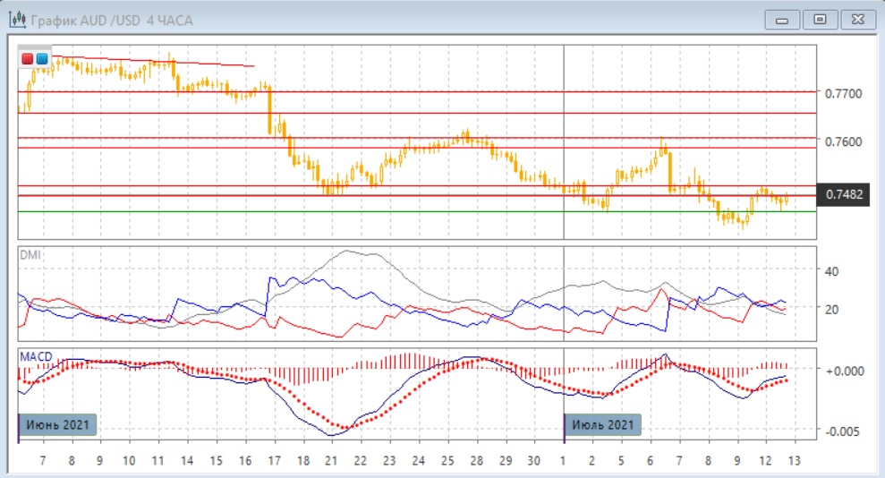На четырёхчасовом графике пара восстановилась выше относительного минимума начала июля на 0,7445. В целом тенденция снижения сохраняется, но восстановление пары выше предыдущих минимумов говорит о стабилизации. Уровень 0,7445 в понедельник выступил уже поддержкой при откате от психологически важного уровня 0,7500. Это может привести пару к новому тестированию 0,7500 в ближайшей перспективе.