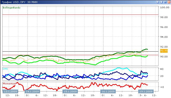 С начала дня доллар движется против йены вблизи уровня 90.92, индикаторы показывают слабый восходящий тренд (ADX ~ 25, DI+ ~ 28), однако это лишь результат усреднения после флуктуационого падения, последовавшего за ростом. Пара должна расти в связи с грядущей инаугурацией Президента США Барака Обамы и ожидаемым понижением ставок Банка Японии, поэтому, в течение дня можно ожидать роста до уровня выше 92.00.