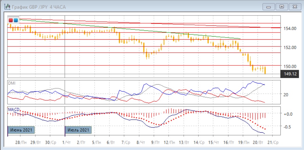 На четырёхчасовом графике образуется небольшая консолидация ниже уровня 150,00 . Более вероятный выход из неё вниз, так как это фигура продолжения, а предыдущем движением было снижение. Пара находится около минимумов апреля, и преодоление уровня 149,00 может облегчить дальнейшее снижение. По индикаторам направленного движения в этом масштабе снижение также очень сильное: превышение DM- над DM+ большое при высоком уровне ADX, гистограмма MACD в отрицательной зоне, линия MACD имеет отрицательный наклон.