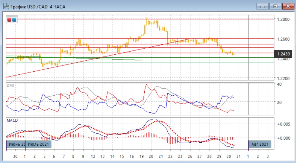 На дневном графике пара резко снизилась от сопротивления на 1,2600. Сейчас она достигла относительного минимума в середине июля выше 1,2400. Важно, что пара довольно легко преодолена важную с психологической точки зрения поддержку на 1,2500. Более вероятно, что снижение будет продолжаться. По индикаторам направленного движения приближается разворот: по более краткосрочным индикаторам пара уже перешла к снижению - гистограмма MACD снижается в отрицательной зоне, линия MACD имеет отрицательный наклон. Превышение DM+ над DM- уже небольшое, и дело движется к пересечению линий.