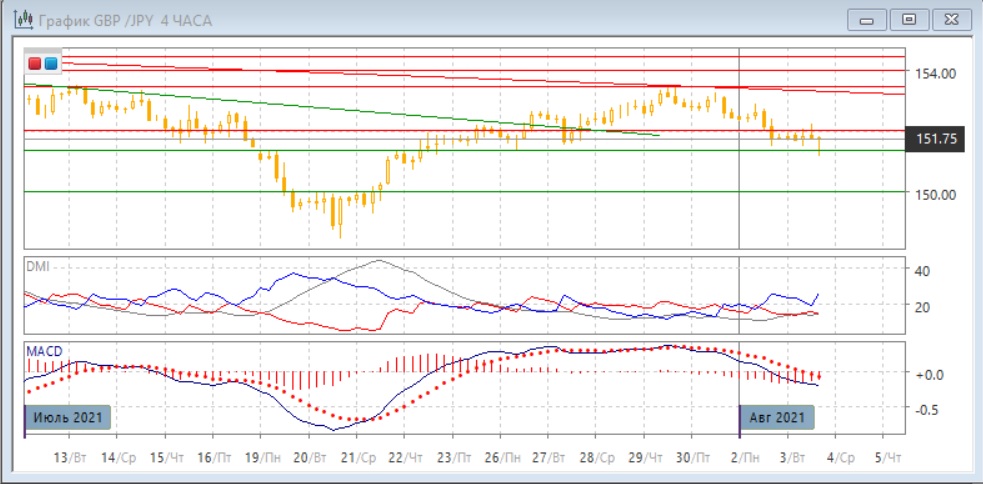 На четырёхчасовом графике пара при отскоке вверх встретила сопротивление на 152,00 (там образовалась "падающая звезда"), но также обозначилась поддержка на 151,00 (там образовался "молот". Сейчас пара, возможно, стабилизировалась. Это может быть похоже на аналогичный диапазон 22-26 июля, только после снижения. Так как тенденцией сейчас является снижение, более вероятен выход из текущих ограничений (151-152) вниз, однако действовать лучше в сторону фактического выхода. По индикаторам направленного движения тенденцией стало снижение: DM- заметно выше DM+, гистограмма MACD находится в отрицательной зоне, линия MACD имеет отрицательный наклон.