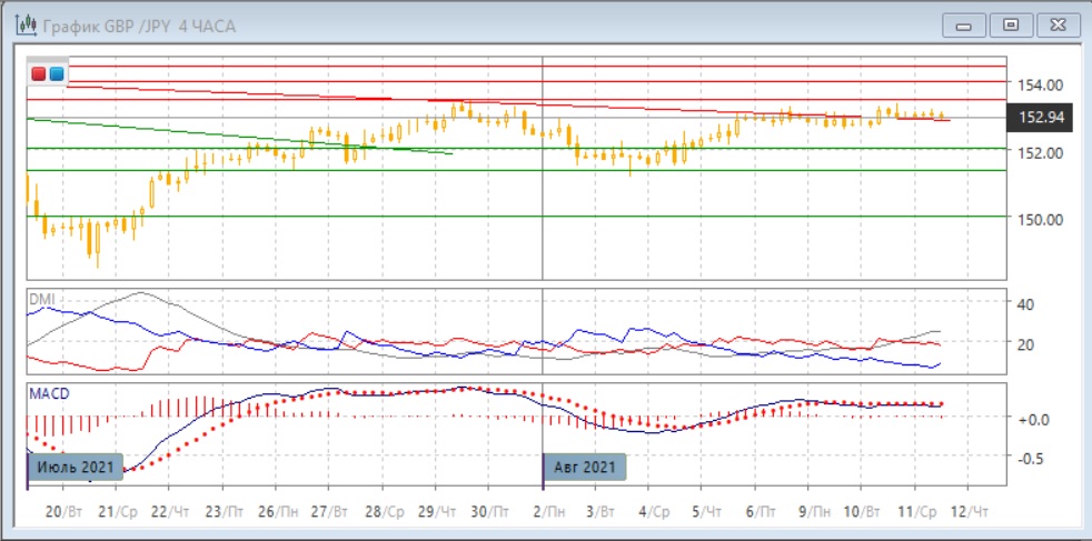 На четырёхчасовом графике пара продолжает находиться в узком диапазоне, но теперь она оказалась выше нисходящего тренда. Образовался ряд свечей "дожи", что, вероятно, говорит о неопределённости. По индикаторам направленного движения в этом масштабе рост замедляется - тенденция видна по превышению DM+ над DM- при росте ADX. Однако то, что новые максимумы пары не подтверждались новыми максимумами по гистограмме MACD, говорит о замедлении роста и увеличивает вероятность отката от 153,50, так как это сильный уровень. Рассчитывать на дальнейший рост до преодоления 153,50 кажется преждевременным. При возвращении пары ниже линии тренда снижение может развиться до минимума августа на уровне поддержки 151,35.