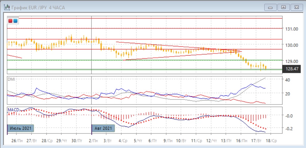 На четырёхчасовом графике после выхода из треугольника с начала августа пара резко снизилась, поддержка находится у 128,45. Так как отскока вверх от этого уровня не произошло, и пара не достигла ближайшего сопротивления на 129,00 (нижняя граница диапазона, из которого пара вышла), более предпочтительным сейчас кажется продолжение снижения. По индикаторам направленного движения снижение - сильная тенденция. Превышение DM- над DM+ очень большое при высоком уровне ADX. Гистограмма MACD в отрицательной зоне, линия MACD имеет отрицательный наклон.
