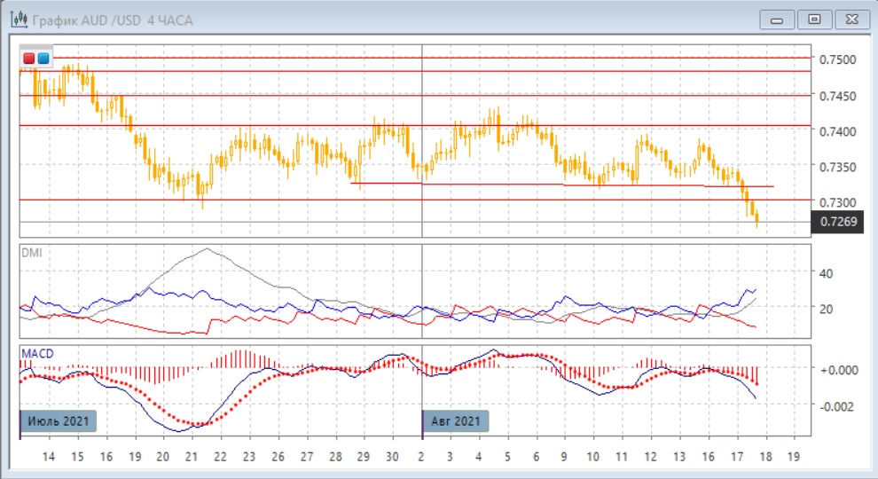 На четырёхчасовом графике пара после прорыва уровня 0,7300 осталась ниже него. Снижение продолжается, и возможность образования ложного пробоя уменьшается. По индикаторам направленного движения тенденцией стало снижение: DM- значительно выше DM+, уровень ADX вырос, гистограмма MACD снижается в отрицательной зоне, линия MACD имеет отрицательный наклон. Даже судя по наклону графика, движение ускоряется. Пока продолжение снижения в краткосрочной перспективе выглядит предпочтительным.