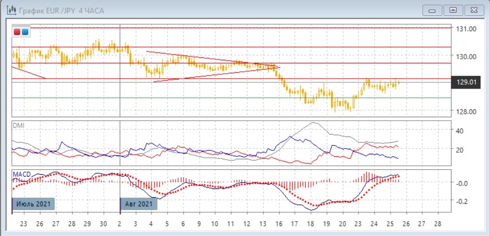 На четырёхчасовом графике пара продолжает тестировать сопротивление на 129,00, что продолжается уже третий день. Если скорректировать уровень до 129,15, то текущее сопротивление почти совпадает с минимумами 3-4 августа. В этом масштабе ситуация почти нейтральная: чем дольше уровень сопротивления не преодолевается, чем более вероятен откат; но с другой стороны - отсутствие отката показывает, что снижение тоже не имеет поддержки на данный момент. Дальнейшее движение в краткосрочной перспективе, вероятно, будет в сторону отхода от уровня 129,00.