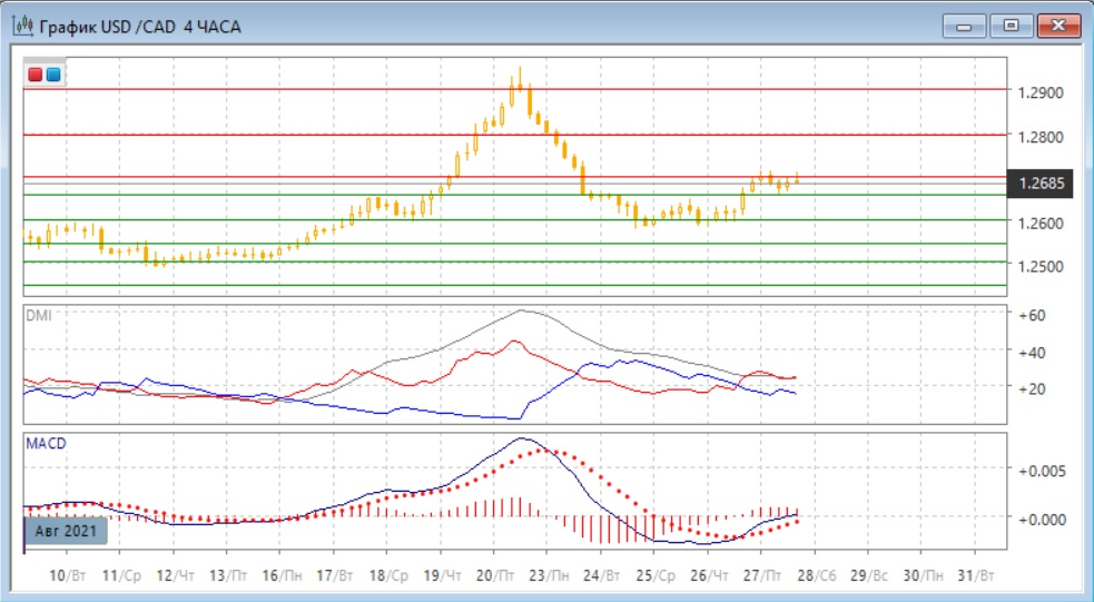 На дневном графике после отскока вверх от "круглого" уровня 1,2600 пара достигла следующего "круглого" уровня 1,2700. Пока рост от 1,2600 можно рассматривать как относительно небольшую коррекцию после сильного снижения. Однако если произойдёт закрепление выше сопротивления на 1,2655 (у максимумов марта и апреля, и около минимума декабря 2020 г.), рост может продолжиться. Последовательность роста относительных максимумов не нарушена, и это пока не подтвердилось разворот вниз. По ADX тенденция роста также сохраняется: DM+ устойчиво выше DM-. Тем не менее, разворотная фигура с вершиной 20 августа, скорее, обозначает завершение большой волны роста с мая.
