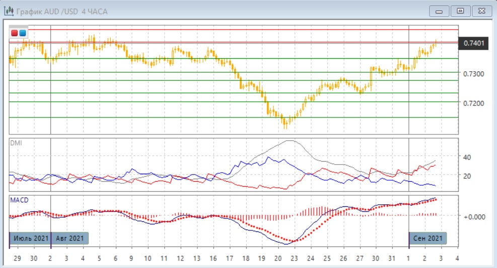 На четырёхчасовом графике уровень 0,7350 при откате выступил уже поддержкой для пары. Отката после достижения следующего сильного уровня сопротивления 0,7400 не происходит. Учитывая, что сейчас имеется медвежье расхождение максимумов пары и гистограммы MACD, вероятность отката увеличивается, но его фактического отсутствие может быть бычьим сигналом - если медвежий сигнал не сработал. Пока не видно, чтобы тенденция роста выдохлась. По ADX тенденция роста сильная: превышение DM+ над DM- ещё больше увеличилось, уровень ADX высокий.