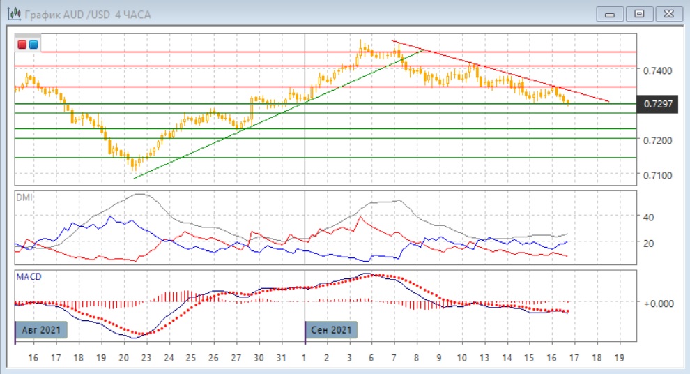 На четырёхчасовом графике последовательное снижение продолжается, относительные максимумы и минимумы пары снижаются. Снижение замедляется, что видно по образованию бычьего расхождения минимумов пары и гистограммы MACD, но подтверждения этого сигнала не было. Сопротивление при отскоке к 0,7350 усиливалось тем, что там не находилась краткосрочная линия тренда, если строить её с 7 сентября. Дальнейшее движение в этом масштабе скорее будет в сторону выхода либо ниже 0,7300, либо выше линии тренда и уровня 0,7350. Пока продолжение снижения остаётся предпочтительным.