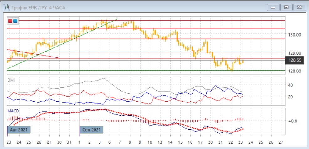 На четырёхчасовом графике пара выросла от уровня поддержки 128,00 до ближайшего уровня сопротивления 128,60 (у минимума 16 сентября и максимума 21 сентября). Образовалось бычье расхождение между минимумами пары и гистограммы MACD. Это показывает замедление снижения и увеличение вероятности разворота, хотя сигнал пока не подтвердился (при преодолении 128,60 нарушилась бы последовательность снижения относительных максимумов пары). Бычьим сигналом является относительно большой размер свечи роста от 128,00 - теперь снижение идёт медленно, а рост сильным импульсом - это также может говорить о развороте, так как в волне снижения с 3 сентября при медленном росте снижения были быстрыми. По ADX тенденция снижения сохраняется: превышение DM- над DM+ остаётся устойчивым, ADX на высоком уровне.